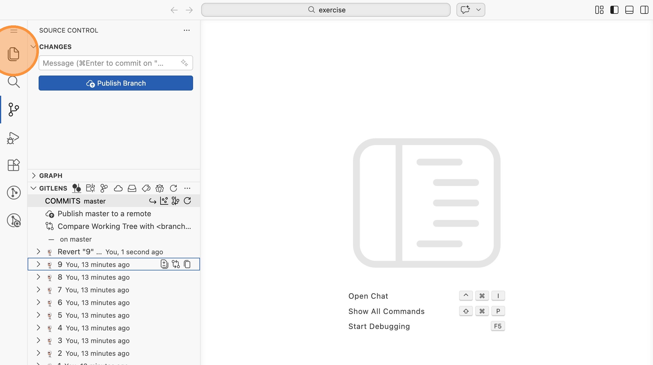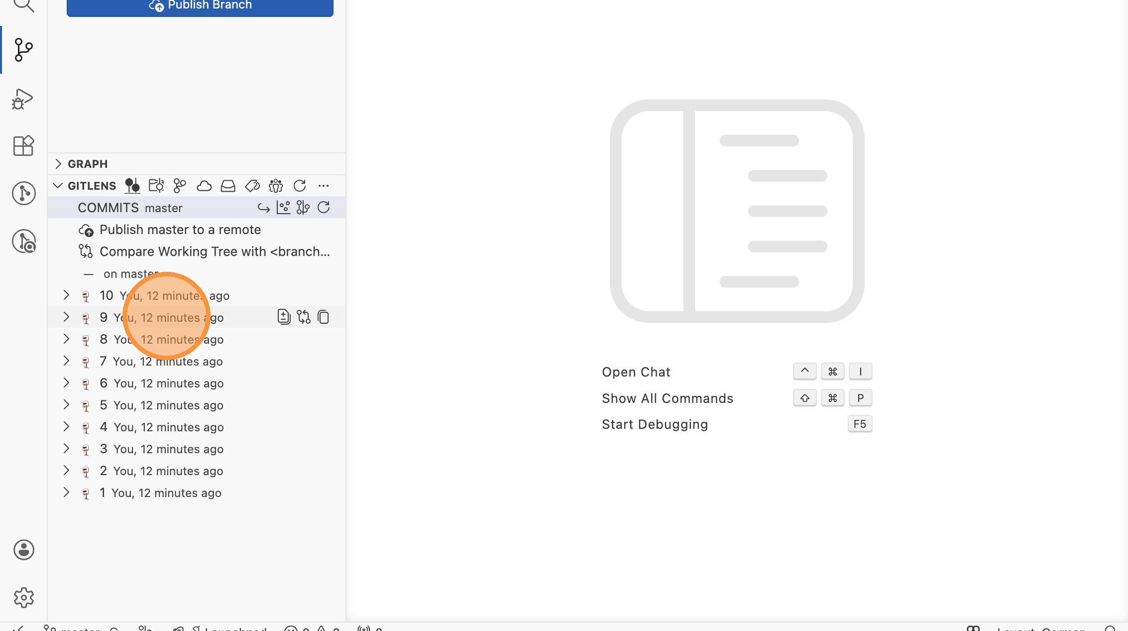 - Wechsle in die Repository-Ansicht und scrolle nach unten zur GitLens-Sektion. Unter "COMMITS" siehst du 10 Commits (1-10).