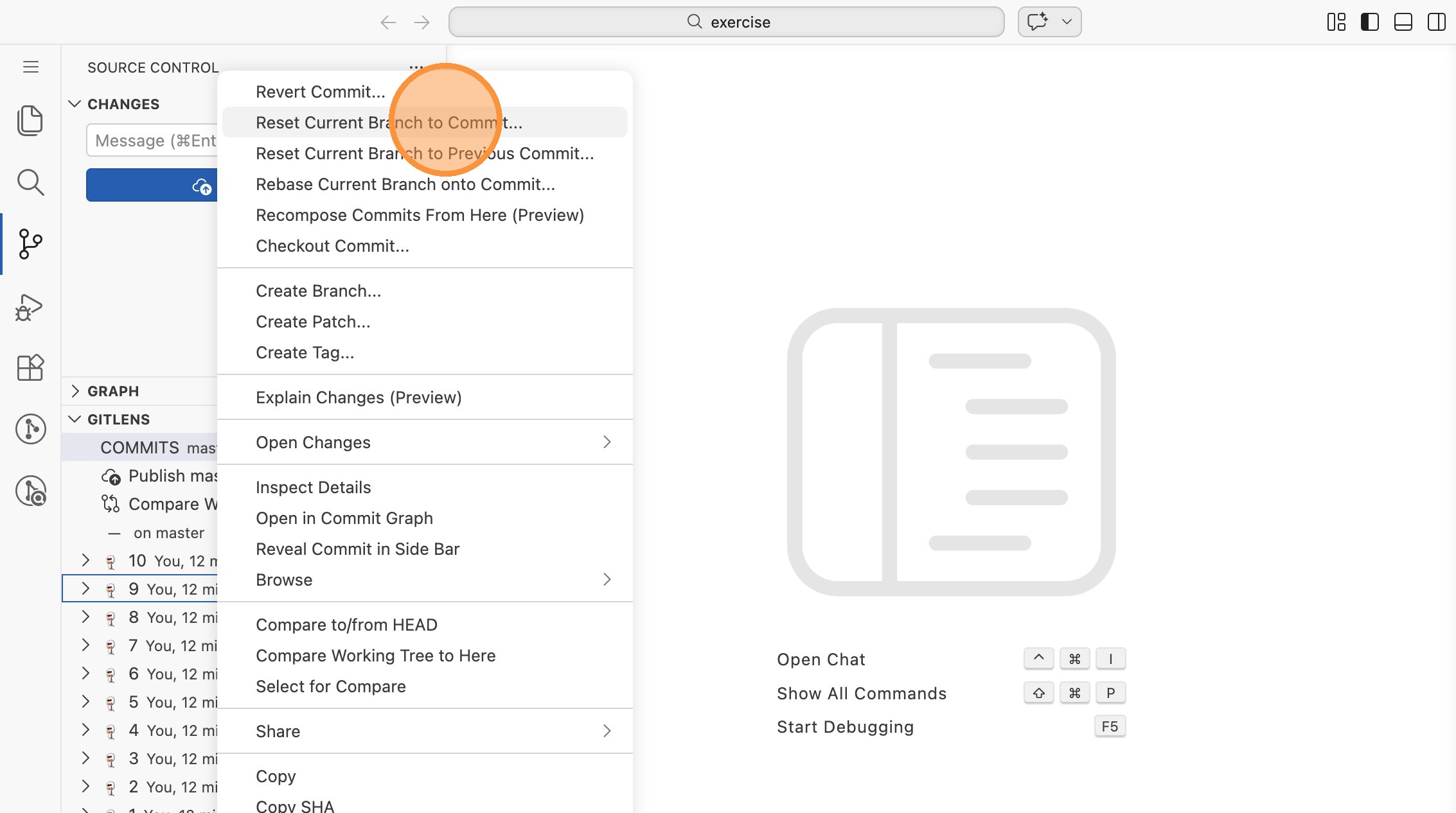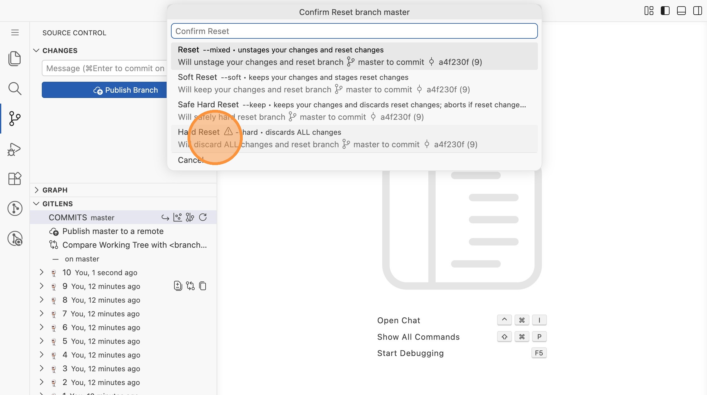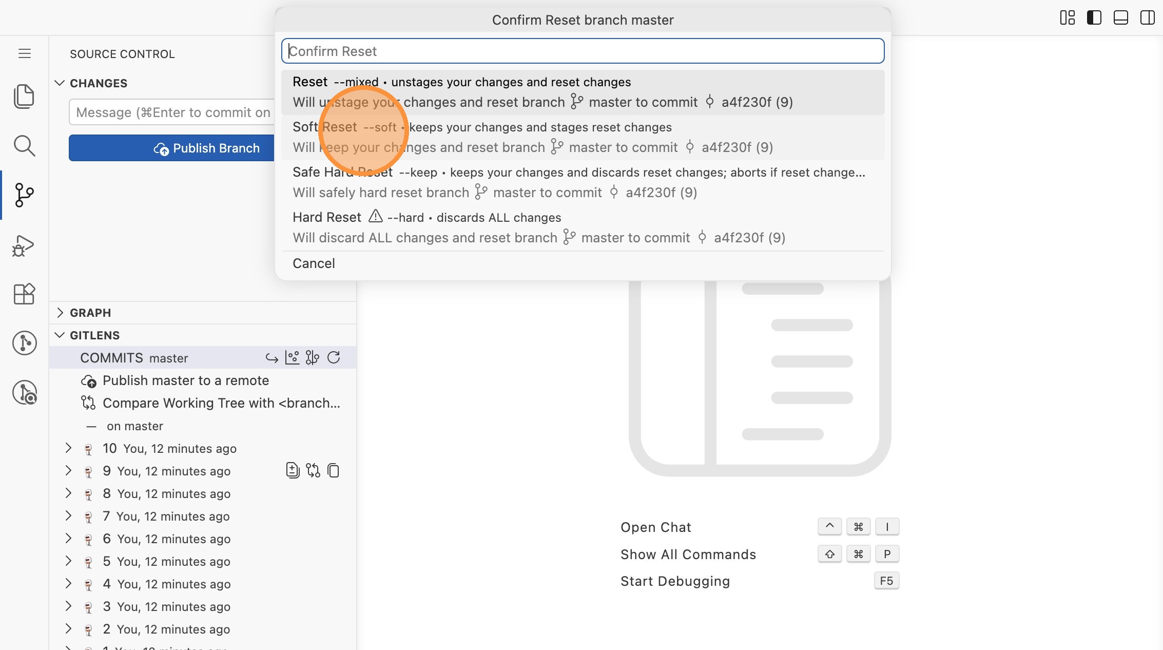 In dieser Übung nutzt du GitLens, um verschiedene Reset-Modi (--soft,