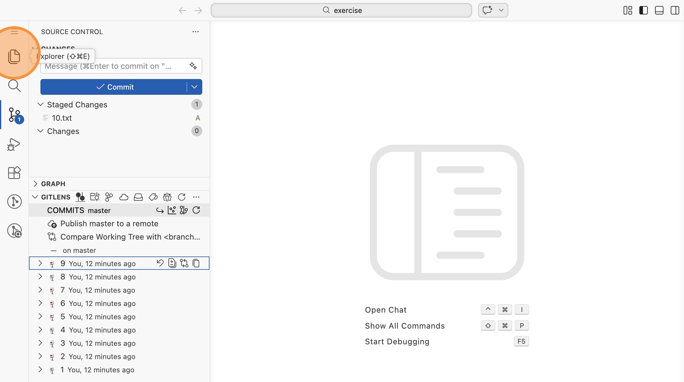 10.txtist jetzt unter "Staged Changes" und die Commit-Liste zeigt nur noch 9 Commits. Committe die Änderung erneut.