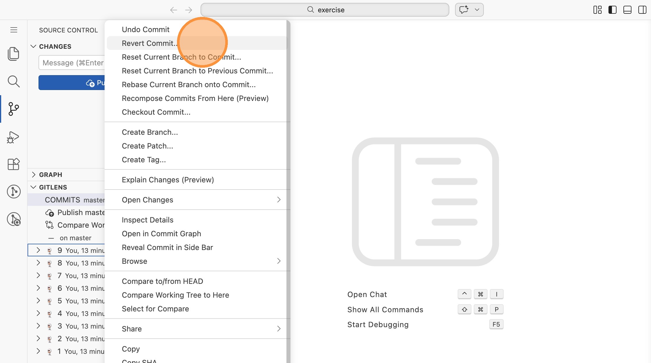 - Rechtsklicke auf Commit 9 und wähle "Revert Commit..."