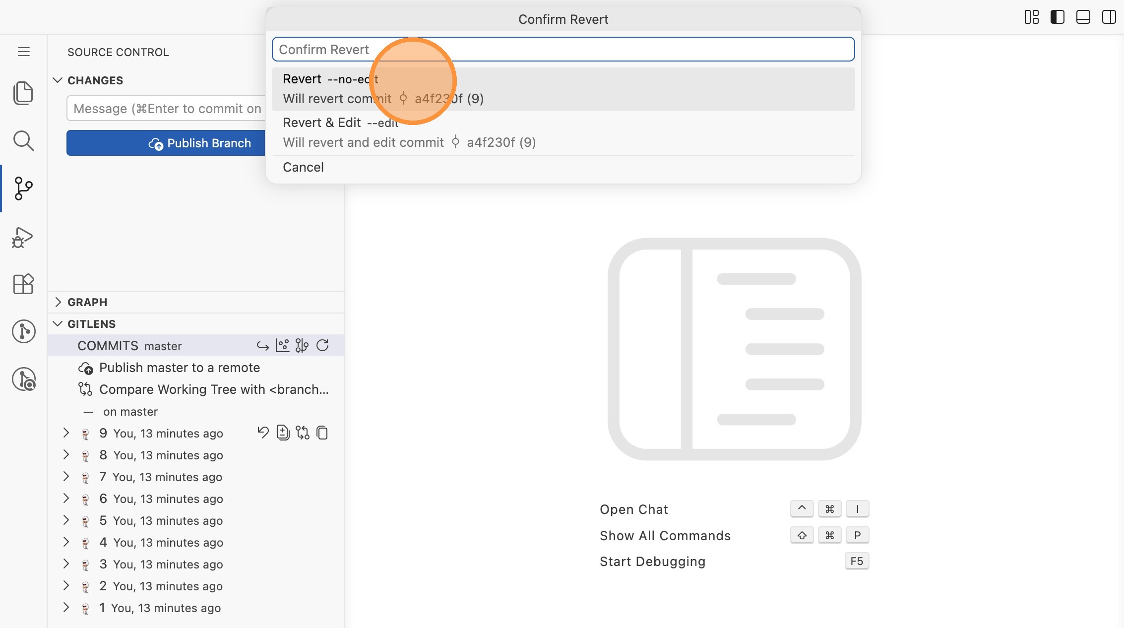 - Wähle "Revert --no-edit". Git erstellt einen neuen Commit, der die Änderungen von Commit 9 rückgängig macht - die Historie bleibt aber erhalten.