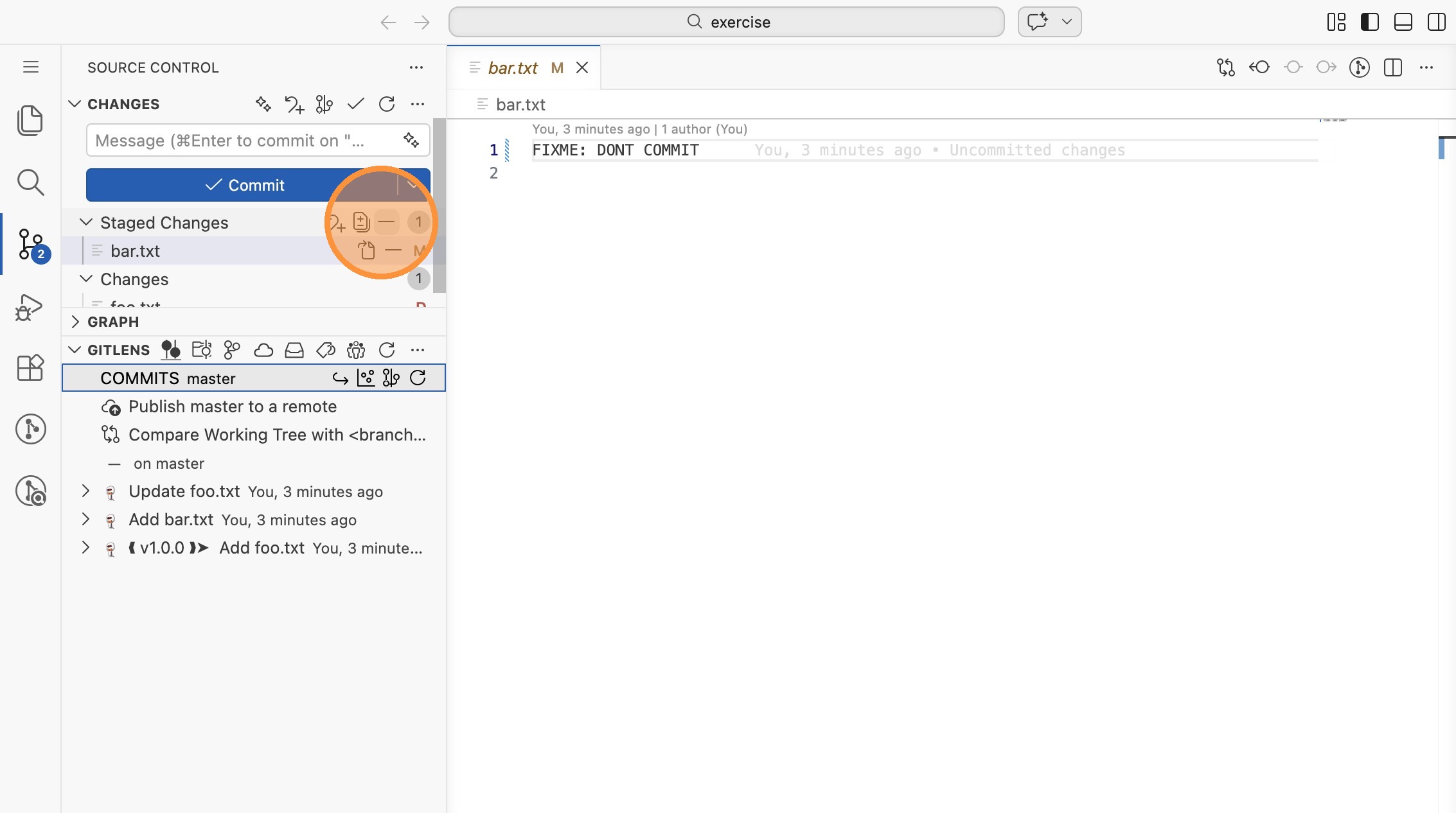 bar.txtist unter "Staged Changes" (bereits gestaged) undfoo.txtunter "Changes" (als gelöscht markiert, D). In der GitLens-Sektion erkennst du auch den Tagv1.0.0.