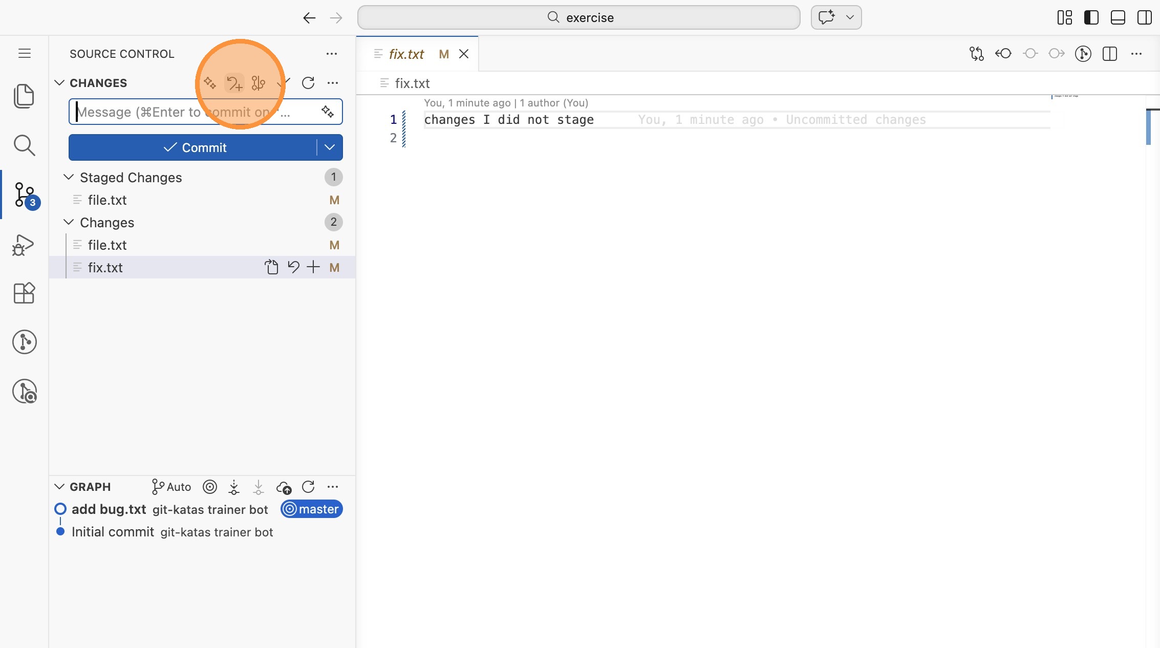 file.txthat sowohl gestagte als auch nicht gestagte Änderungen,fix.txthat nur nicht gestagte Änderungen. Wechsle in die Repository-Ansicht.