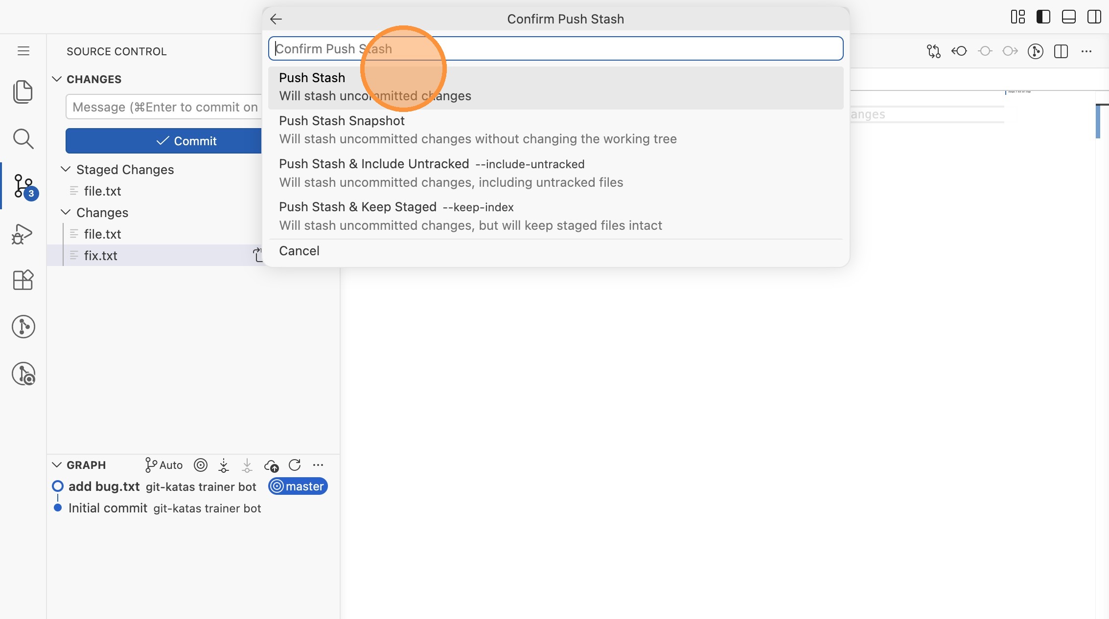 - Klicke in der Toolbar auf das Stash-Symbol (das Pfeil-nach-unten-Symbol neben den anderen Icons). Gib als Nachricht "pending changes" ein und wähle "Push Stash".