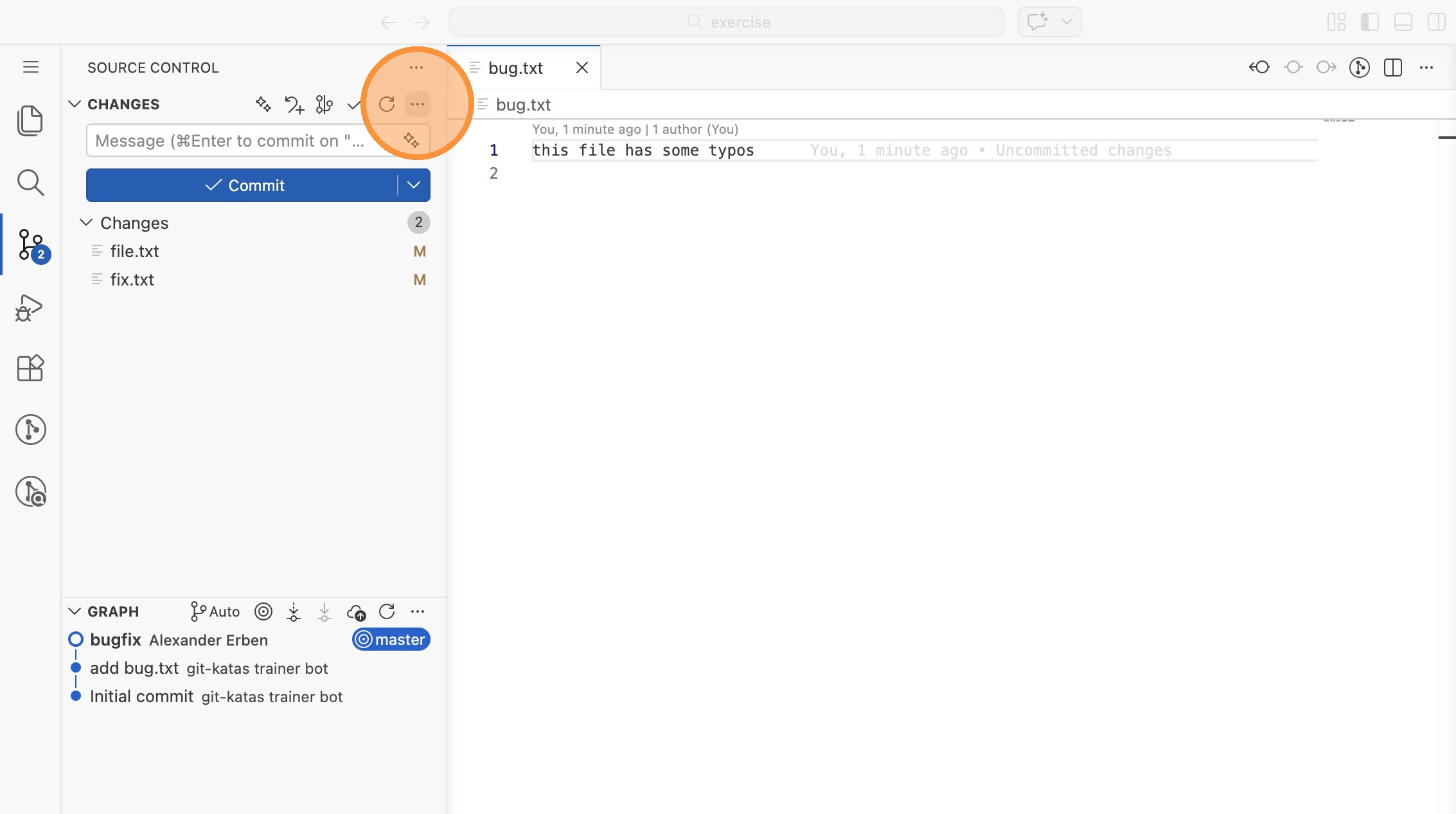 bug.txt, behebe die Tippfehler und committe die Änderung als "bugfix". Stage und committe wie gewohnt.