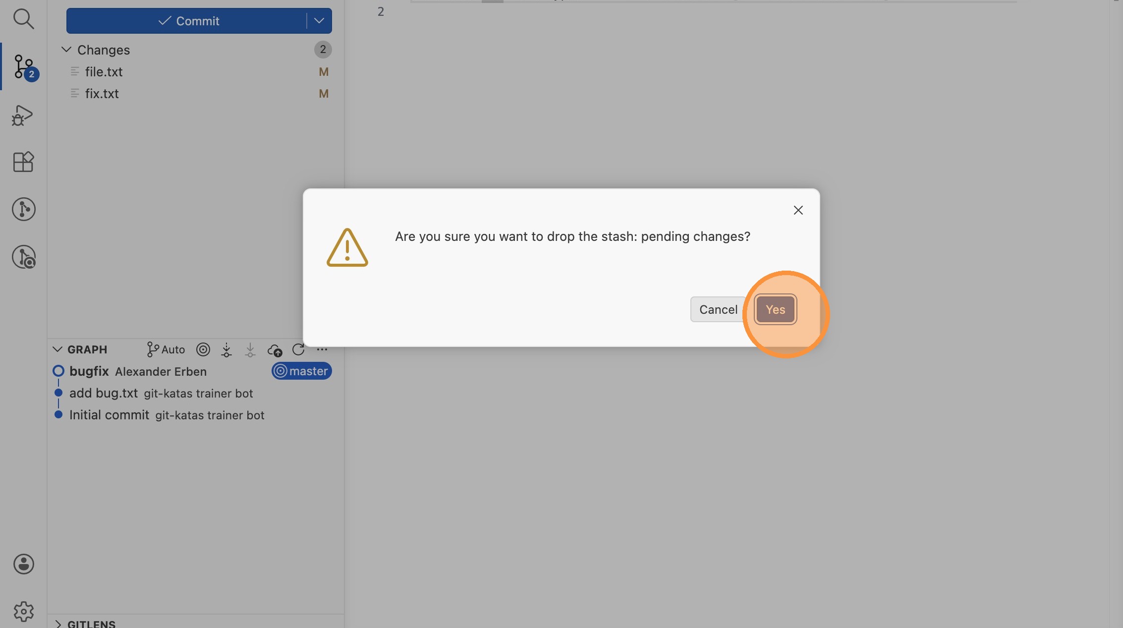 ...→ "Stash" → "Drop Stash...", wähle den Eintrag "pending changes" und bestätige mit "Yes".