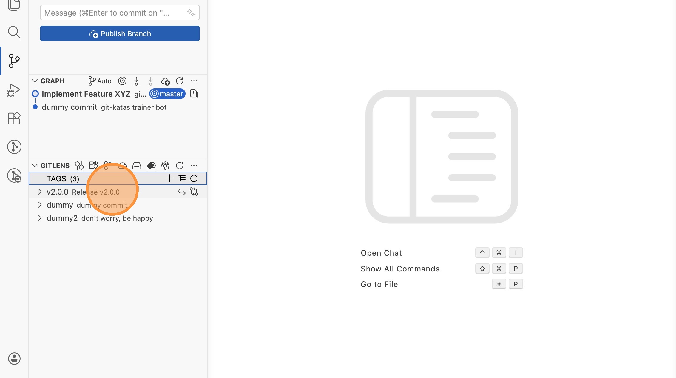 - In der GitLens-Sektion unter "TAGS" erscheint der neue Tag